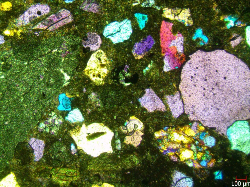 The petrographic thin section contains a world of microscopic elements that are thinner than human hair. With a thickness that is only 30 µm, or one-third that of a human hair, it allows you to view concrete at its most basic form.